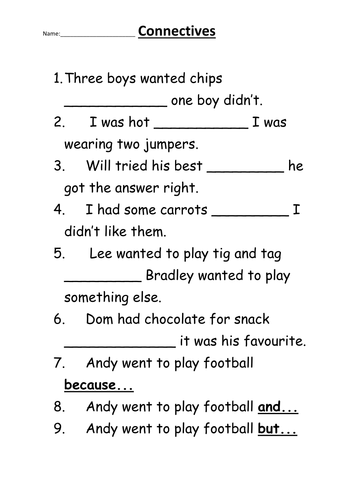 Accordingly all the same an effect of an outcome of an upshot of as a consequence of as a result of because caused by consequently despite this even though hence however in that case moreover nevertheless otherwise so so as stemmed from still then therefore though under the circumstances. In this language arts worksheet, your child gets practice combining two simple sentences into one compound sentence using joining words such as because and conjunctions such as and, but, so, and for. Connectives can be conjunctions, prepositions or adverbs. Let's connect (connectives game) (priya shah) oral connectives & conjunctions activity (chris hardwidge) doc B2 connectives and linking words con004 fill in the correct connectives and linking words from the list.